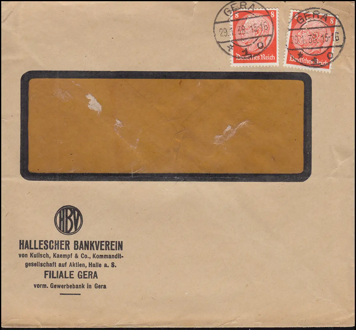 Trou de l'entreprise B sur Hindenburg 8 Pf. MeF sur lettre locale GERA 29.1.38