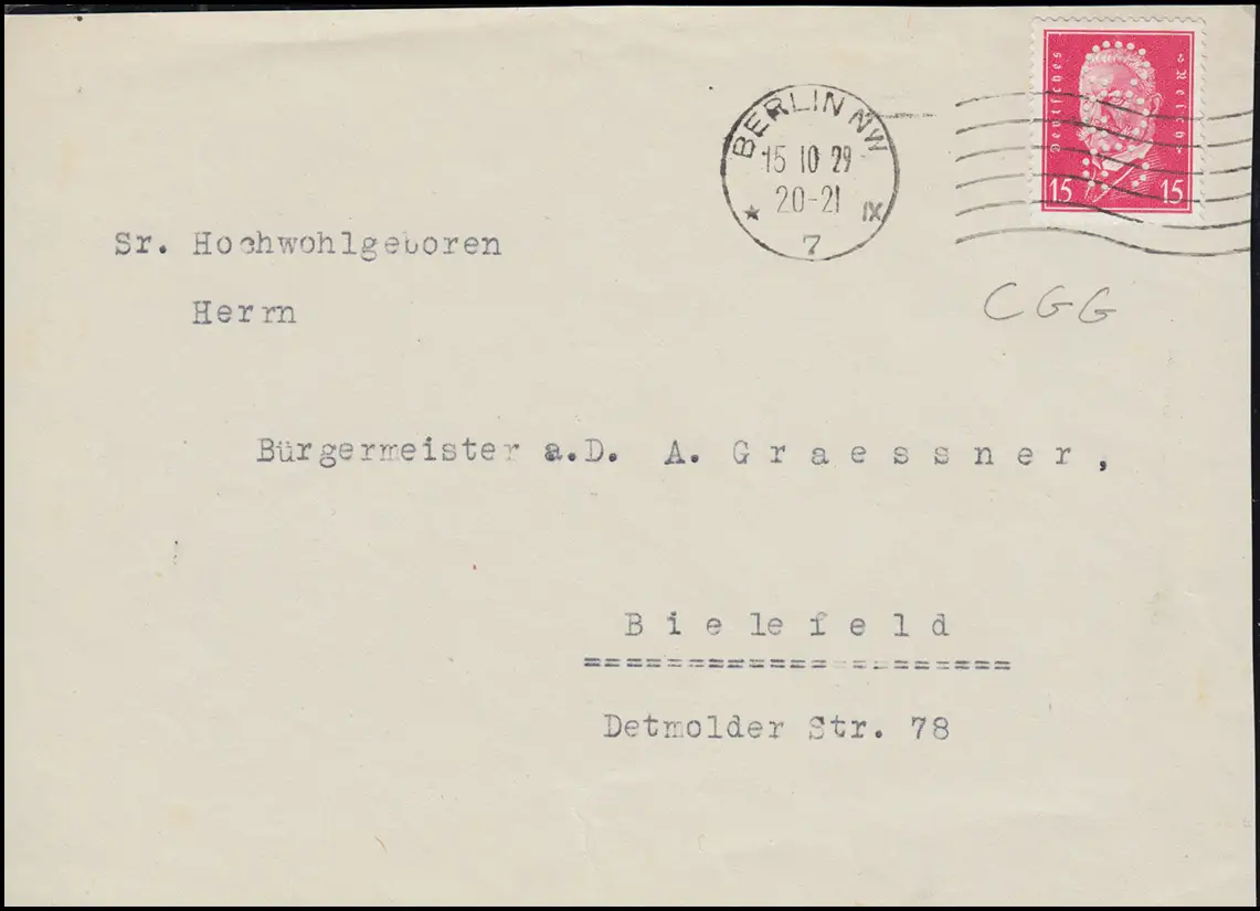 Trou de l'entreprise CGG sur Hindenburg 15 Pf sur le devant de la lettre BERLIN 15.10.29