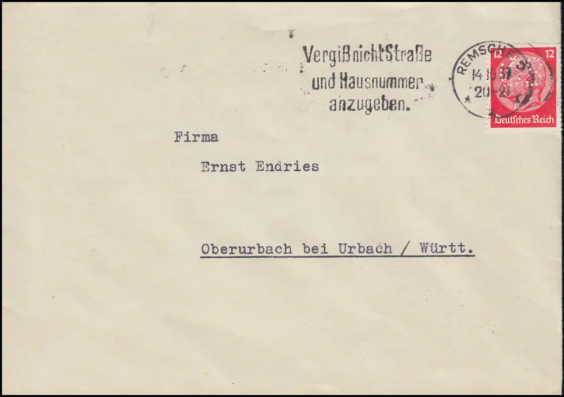 Trou de l'entreprise CS sur Hindenburg 12 Pf comme EF sur lettre REMSCHEID 14.10.37