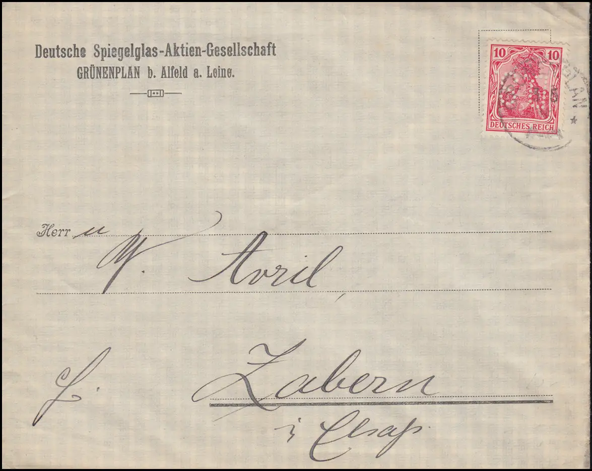 Trou de société D.S. debout tête sur Germania 10 Pf. EF sur lettre GRÜNEPLAN 3.5.15