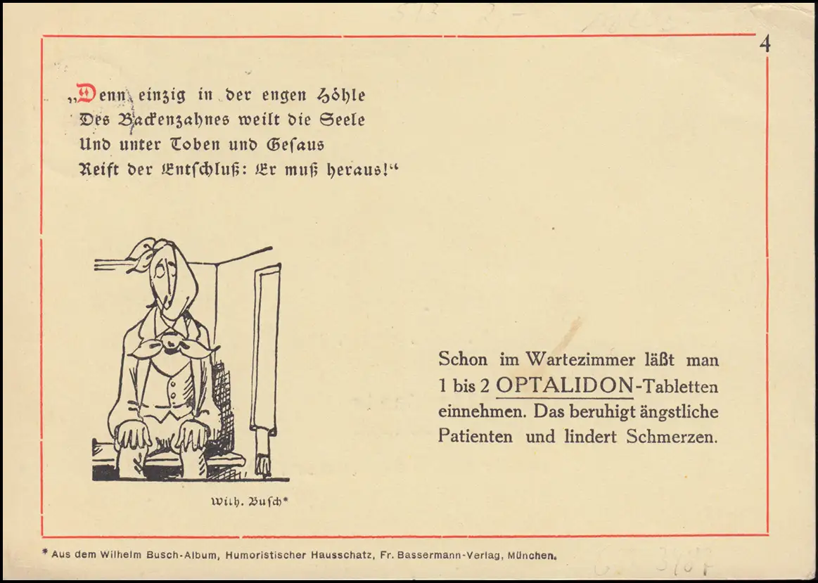 C'est une impression à Porto avec publicité arrière pour OPTALIDON (avec citation et dessin de Wilhelm Busch) à un médecin dans le hall / Salle. Examen: original Référence produit: 00000000034664>p>Remarque: Cet article n'existe qu'une seule fois. Vous recevrez exactement l'article représenté.