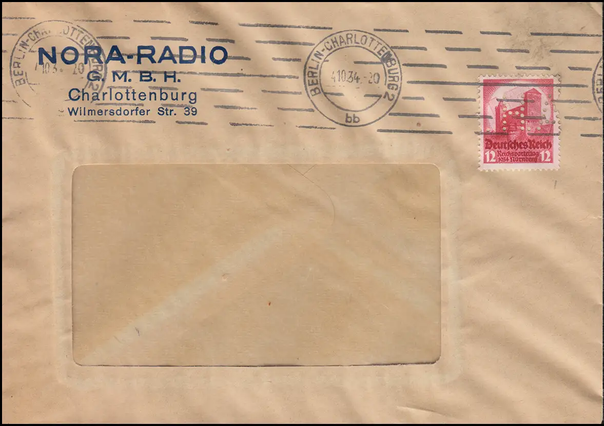 Trou de l'entreprise H.A. sur 547 Nuremberg 12 Pf EF Lettre BERLIN-CHARLOTTENBURG 4.10.34