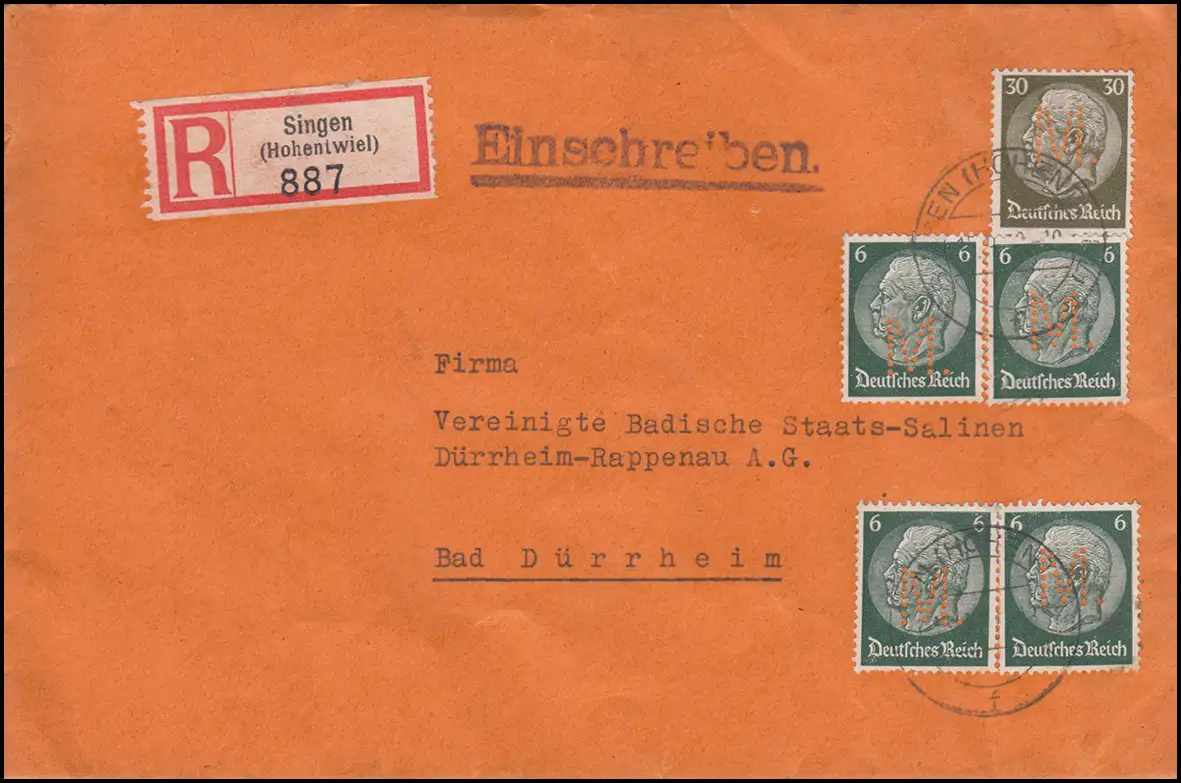 Trou de l'entreprise M. sur les marques Hindenburg 6+30 Pf comme lettre MiF R SINGEN 15.9.39