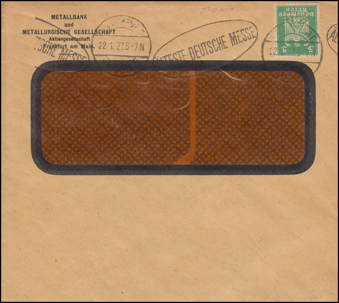 Portofrankaur individuel de Metallbank et de la société métallurgique AG à Francfort / Main sur impression (enveloppe de lettre de fenêtre). Tampon publicitaire " ALTESTE FRANÇAIS MESSE ." N° de catalogue: 356 Examen: original Numéro d'article: 00000000031095>Note: Cet article n'est disponible qu'une fois. Vous recevrez exactement l'élément représenté.