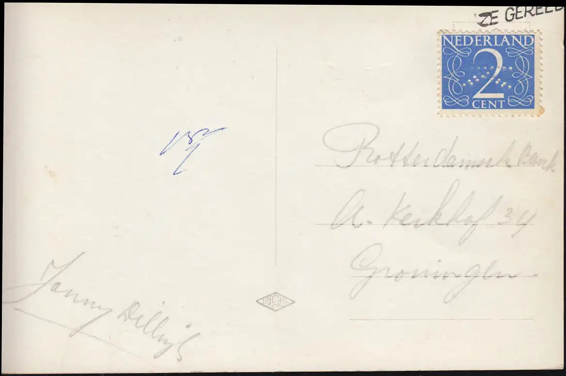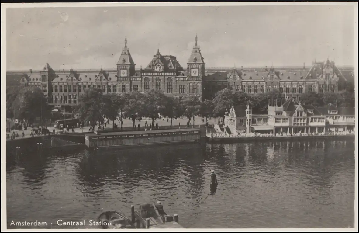 Perçage/Perfin K à 469 chiffres sur AK Amsterdam Centraal Station, vers 1950