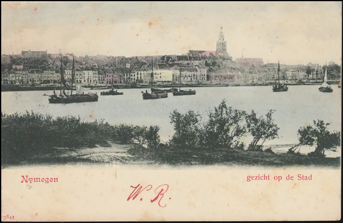 Trou de l'entreprise/Perfin K à 50 chiffres sur AK Nymegen Panorama AMSTERDAM 20.6.1901