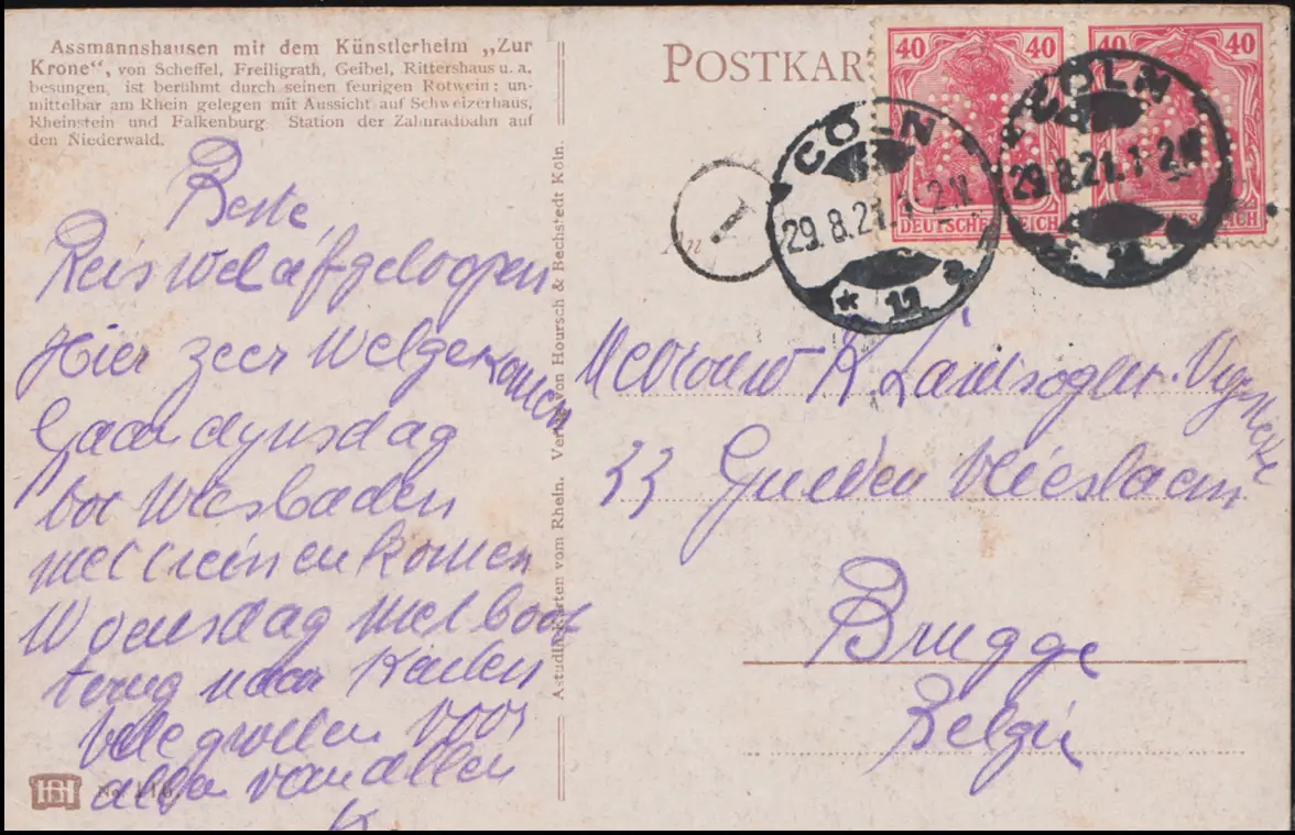 Perfin P.B. sur Germania 40 Pf. MeF Assmannshausen CÖLN 29.8.21