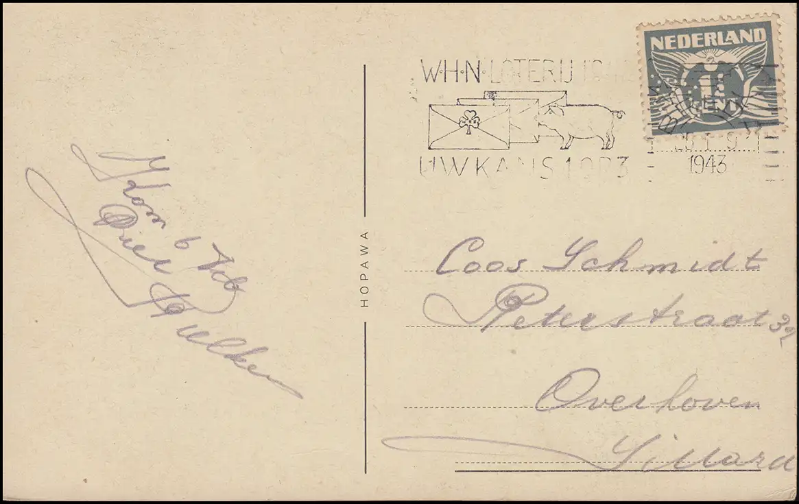 Perfin S.B. sur 281 Pigeons Carte de vue Valkenberg BREDA 25.1.43