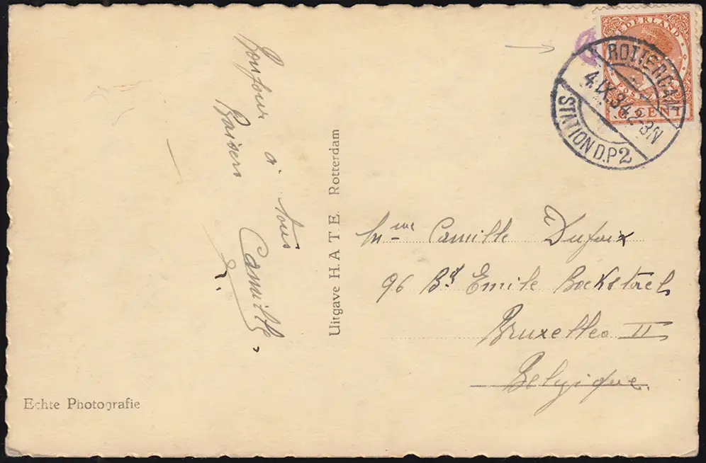 Perfin S.B. en tête de la carte postale internationale vers Bruxelles / Belgique N° de catalogue: 152 Examen: original Référence produit: 00000000032798