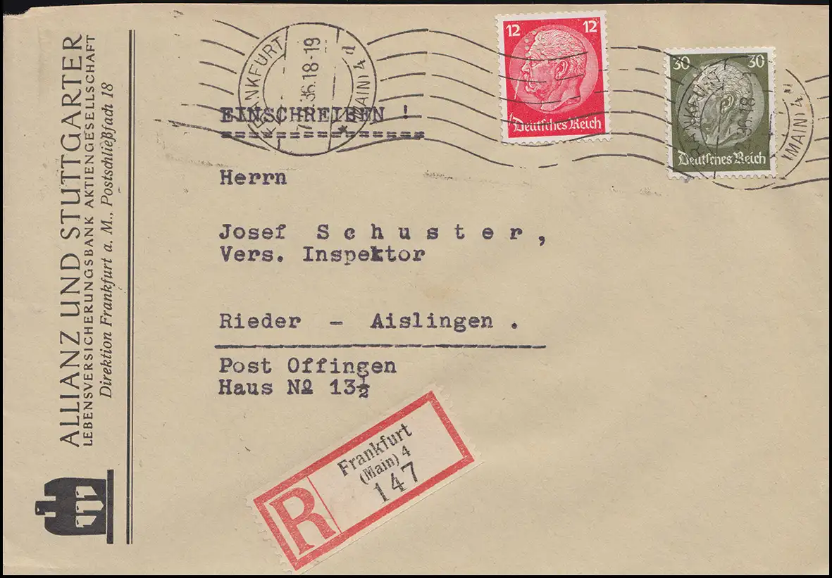 der Allianz und Stuttgarter Vieversicherung AG / Direction Frankfurt / Main, portoebelen Mischfranzatur einschriften zuschmeld zu Beschräftstpel Überstigt ZÜZZEURG 8.2.36 N° de catalogue: 414 Examen: original Référence produit: 00000000035075