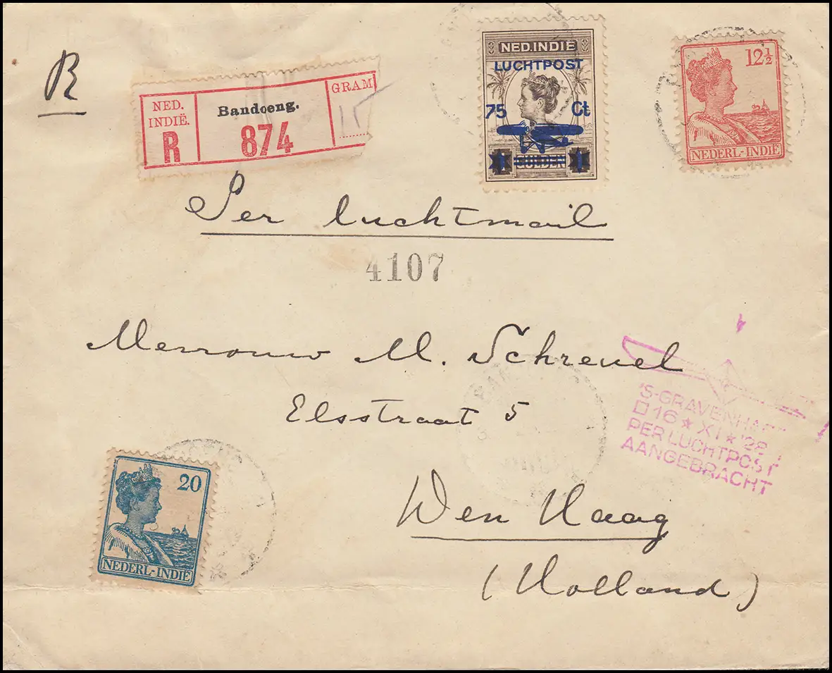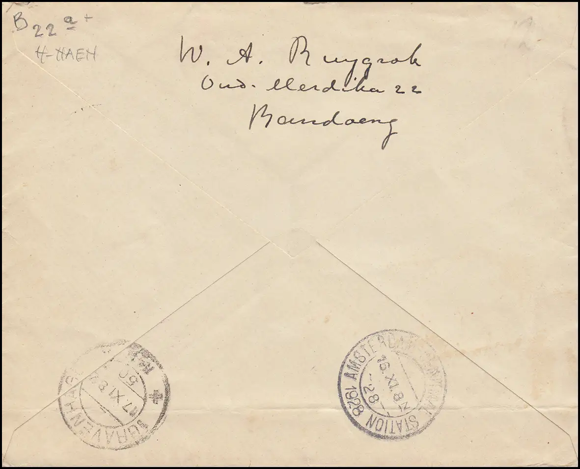 Lettre recommandée de BANDOENG 3.11.28 à La Haye / Hollande par AMSTERDAM 16.11.29 et le cachet d'arrivée S'GRAVENHAGE 17.11.1928 Vérification: original Référence produit: 00000000034486>Note: Cet article n'est disponible qu'une seule fois. Vous recevrez exactement l'article représenté.