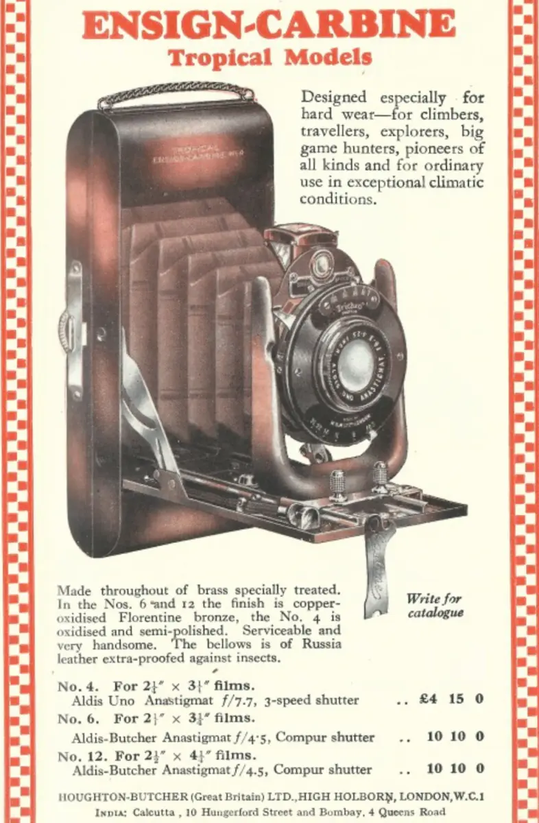 Houghton a produit de très beaux foldings tropicaux, tous caractérisés par un revêtement "en cuivre oxydé " (bronze Florentin d'après Mc Keown, donc un laiton à 85 % de cuivre et 15 % de zinc) et soufflet cuir havane.