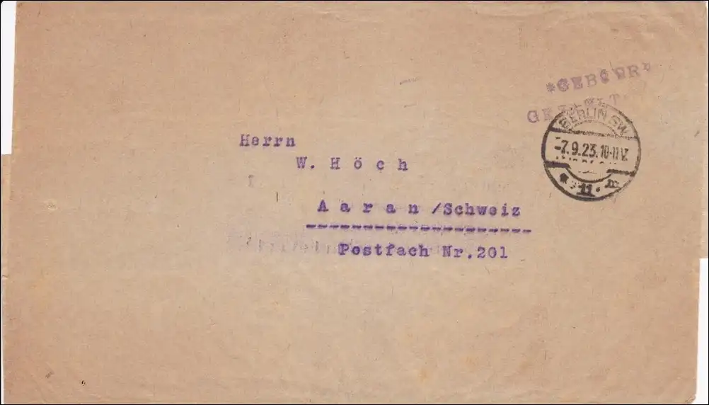 Frais payés: Lettre de Berlin à Aaran/Suisse 1923