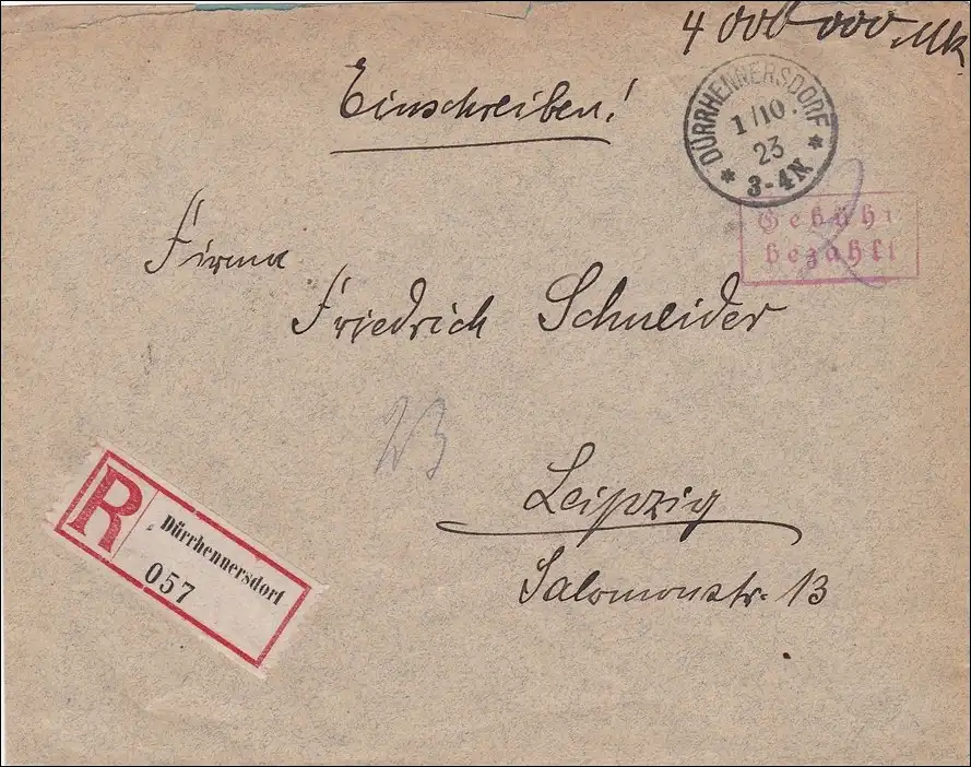 Frais payés: Lettre de Dürrhennersdorf 1923 à Leipzig