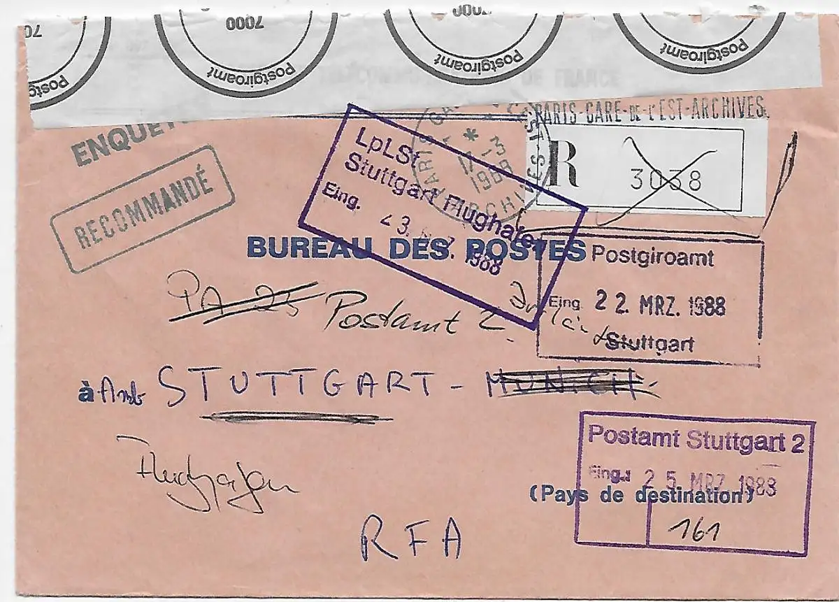 Frankreich Einschreiben Paris 1988 nach Stuttgart, Amtlich verschlossen Postgiro