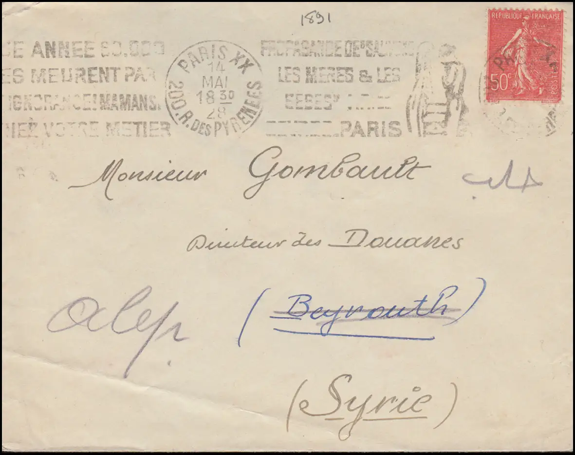 France: timbre publicitaire PARIS XX 200 R. DES PYRENNES 14.5.1928 vers la Syrie