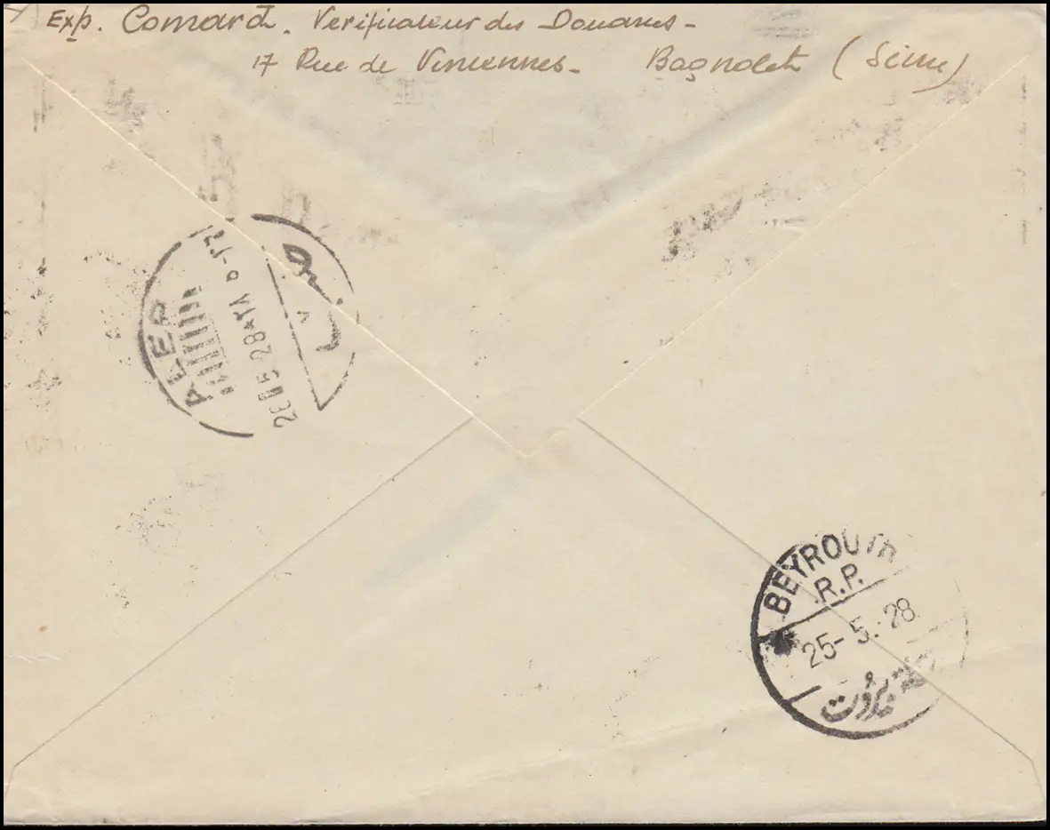 vers la Syrie via le Liban: BEYROUTH / BERUT 15.5.28, Tampon d'arrivée ALEP / ALEPO 26.5.28 Vérification: original Référence produit: 00000000035239>P>Note: Cet article n'est disponible qu'une seule fois. Vous recevrez exactement l'article représenté.