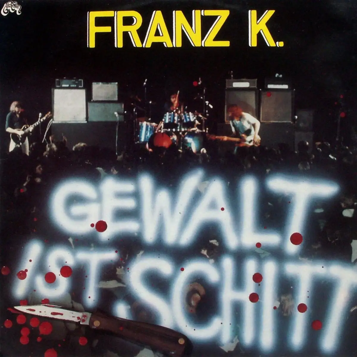 LP Album Franz K. - La violence Est Sh*t, Etat Lame M- Tulle M; Fabriqué en Netherlands 1980 Aladin ALA 84356, Tracks Toujours Encore Encore Et Encore 4:18, Oubliez Il 6:09, On Ne peut pas avoir Tout 3:59, Course,Frère Courir 4:34, Voyez Le Clown 5:09; Clownerie 2:54, Le Boir 4:49