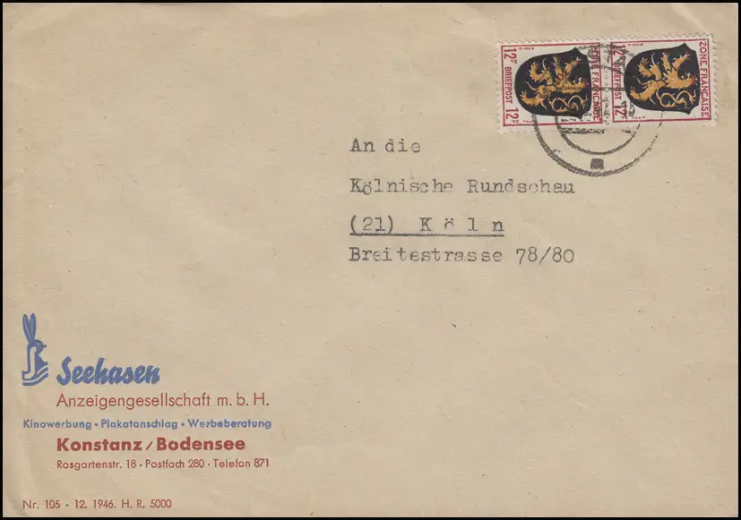 Franz. Zone Général MiF 6 Armoiries + chiffre MeF Lettre CONSTANZ 22.1.47 à Cologne