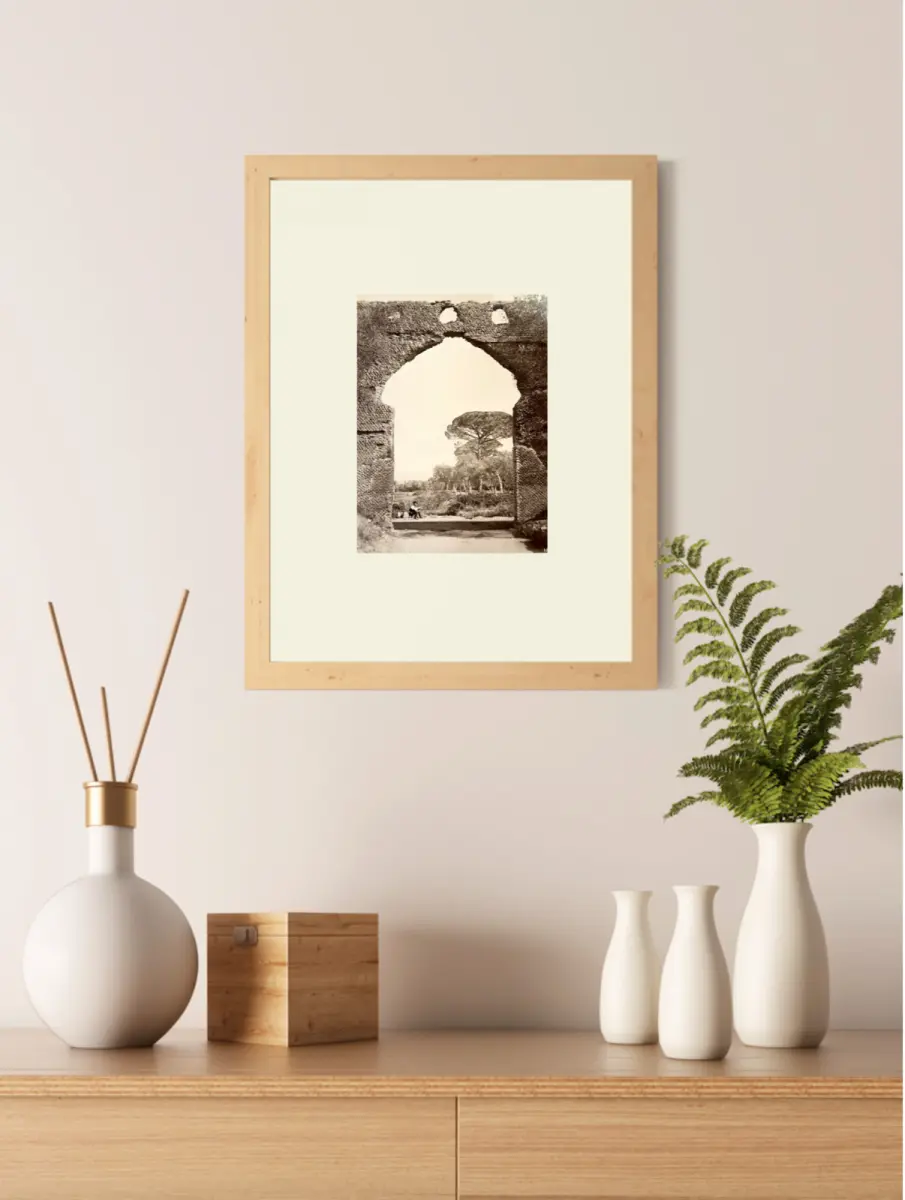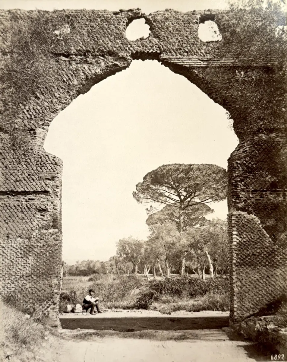 Probablement un autoportrait du photographe comme il se pratiquait souvent à cette époque, sous l'Arc de Pecile de la Villa Adriana à Tivoli, près de Rome