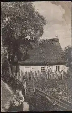 Frau und Kind vor einem Bauernhaus, auf dessen Dach ein Storch steht. Foto - Feldpost 1916. Knicks. (Polen, Russland, Litauen)