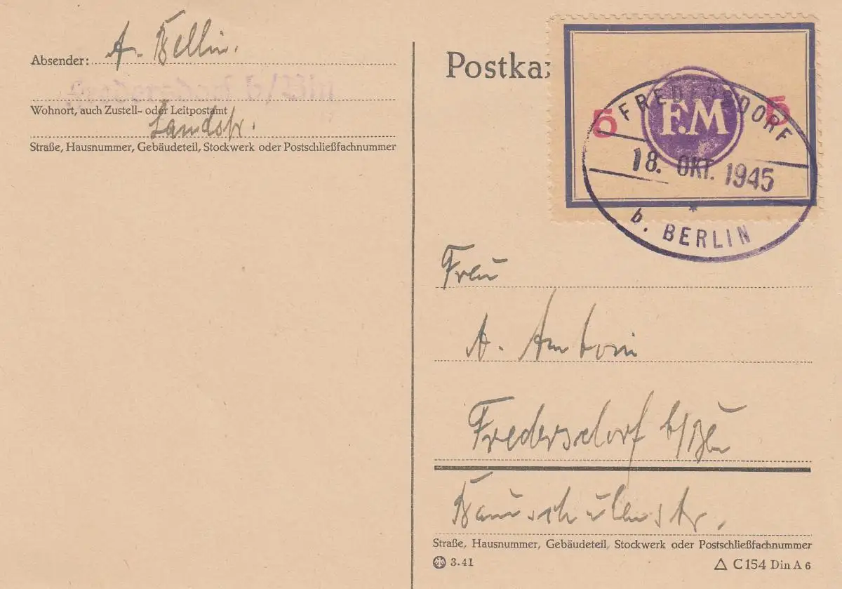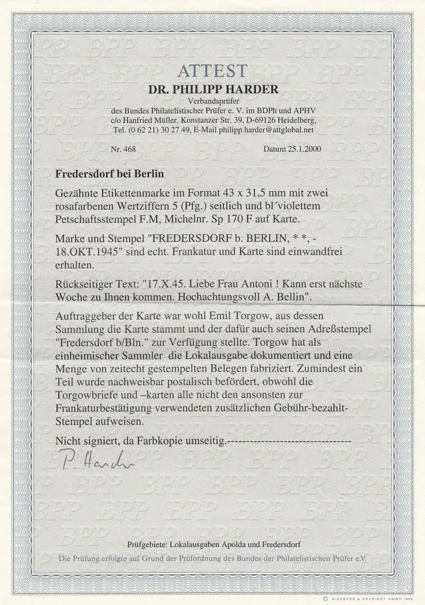 Fredersdorf bei Berlin, Minr. Sp 170 F, sur carte, 18.10.45, BPP Attest