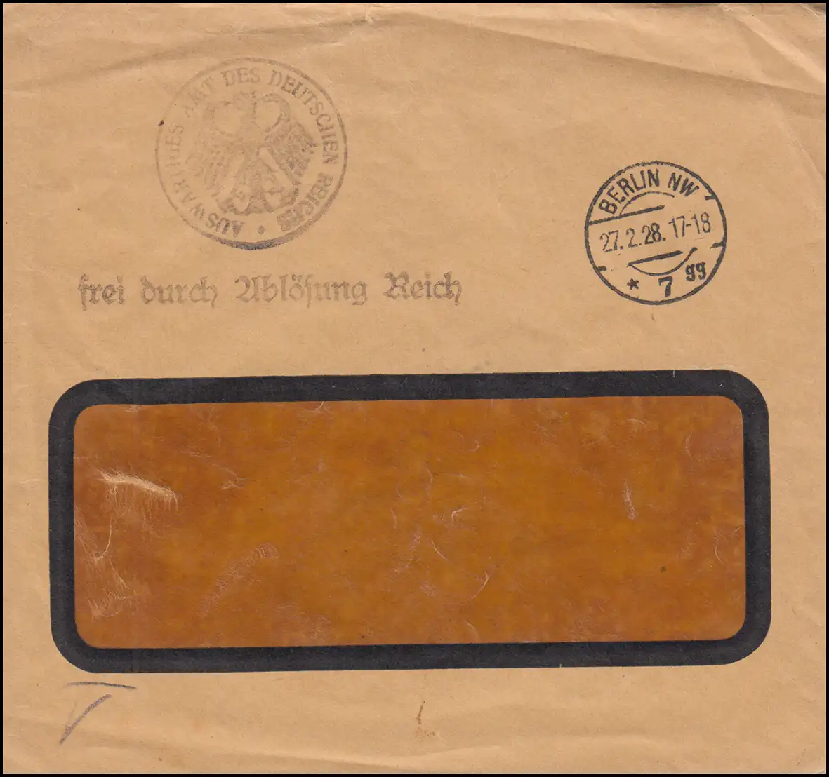 Libre par remplacement du ministère fédéral du Reich allemand Lettre BERLIN 27.2.1928