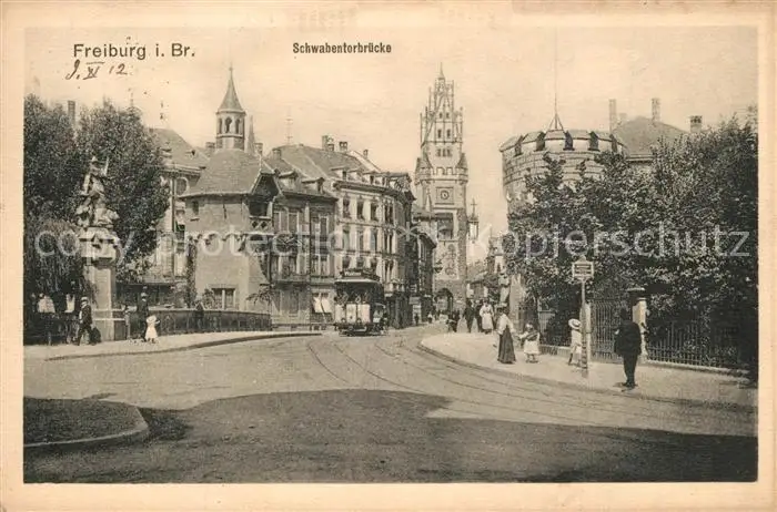 Freiburg_Breisgau Schwabentorbr?cke Strassenbahn Freiburg Breisgau postalisch gelaufen 1912 Erhaltung siehe scans [LiesaD40] LiesID40