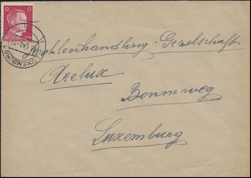 Marque libre Hitler 12 Pf rouge EF Lettre locale Charbonnage Arelux LUXEMBOURG 23.3.42