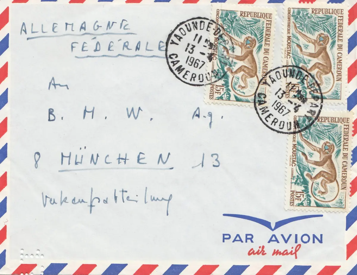 French colonies: Cameroun 1967 air mail Yaounde depart to BMW Munich
