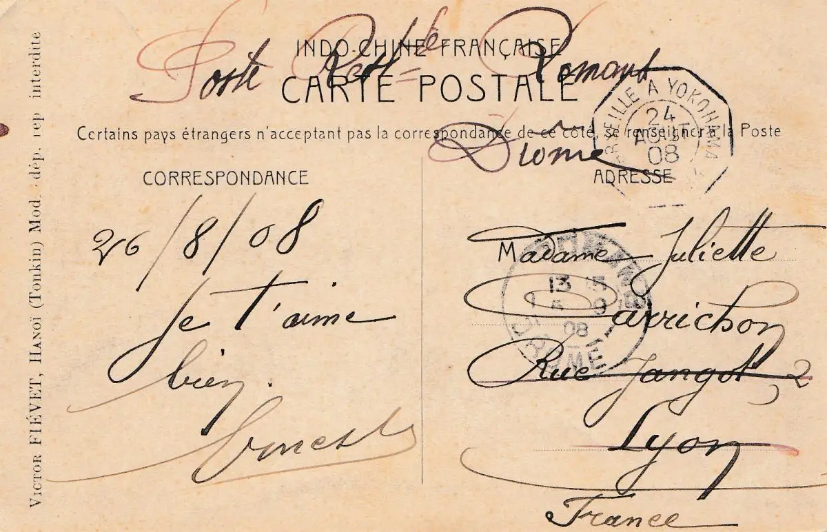 French colonies: Indo-chine 1908: post card Tonkin to Lyon