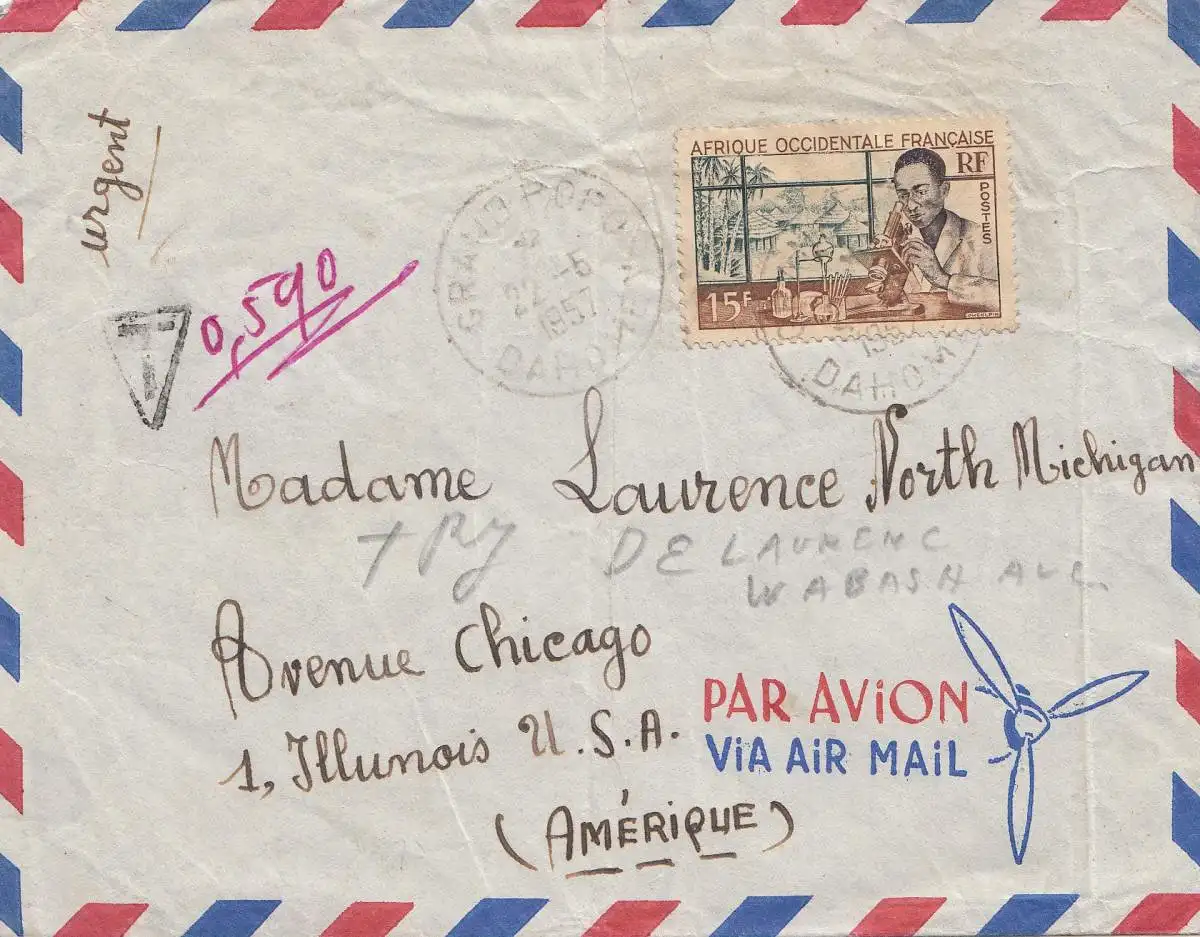 French colonies: Ivory coast Grand Popo 1957 to Chicago, Taxe, Poste due