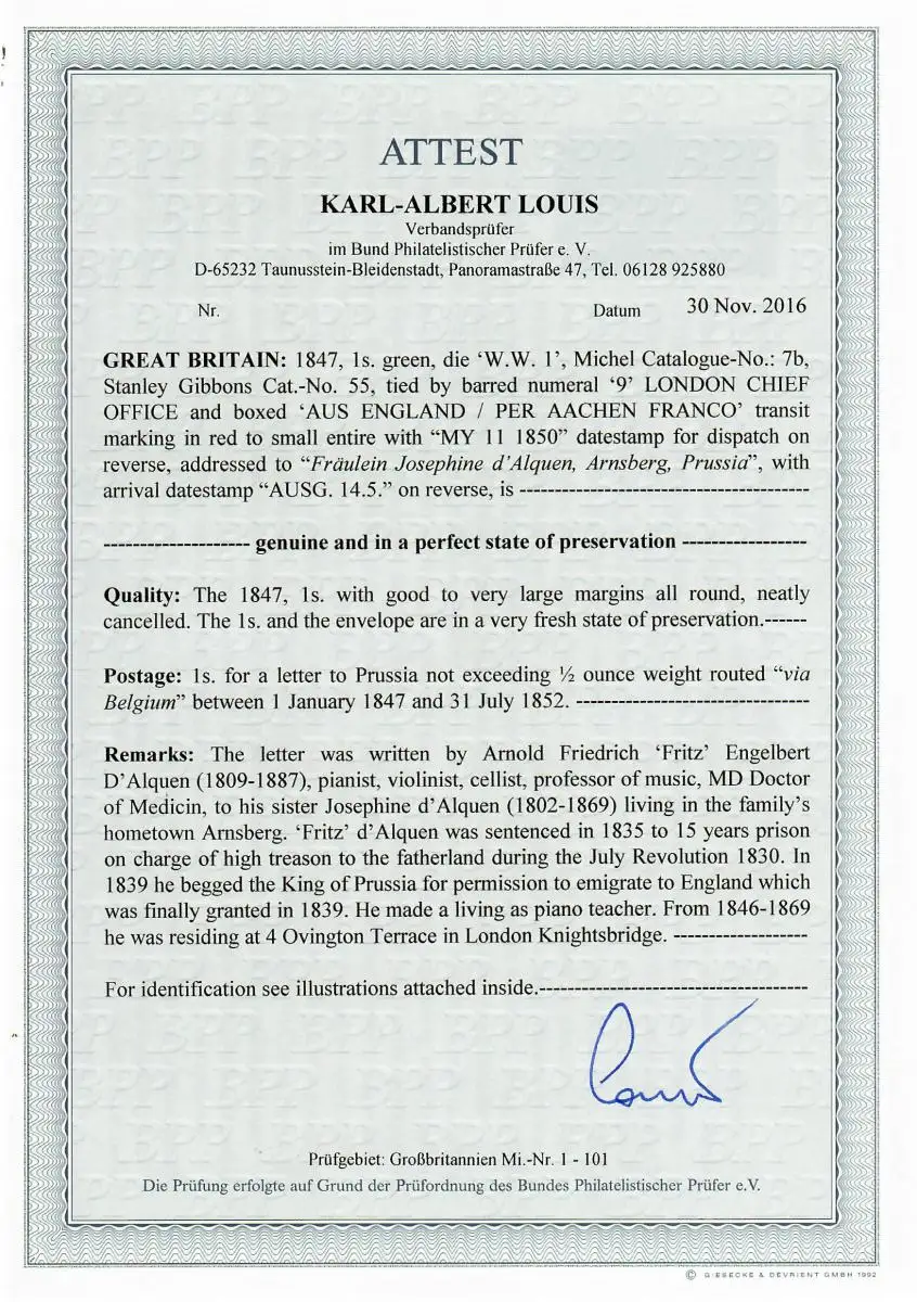 GB 1847: # 7b, SG 55, London chief office to Arnsberg, 2x certificates