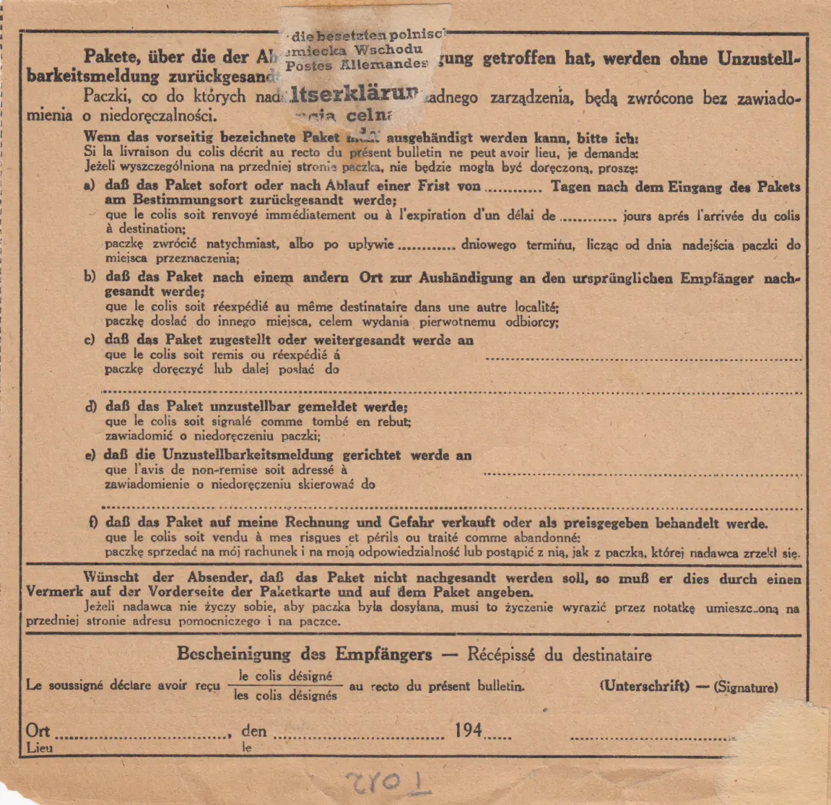 Carte de colis GG internationale Glowno-Erfut/Stager, EF #88A