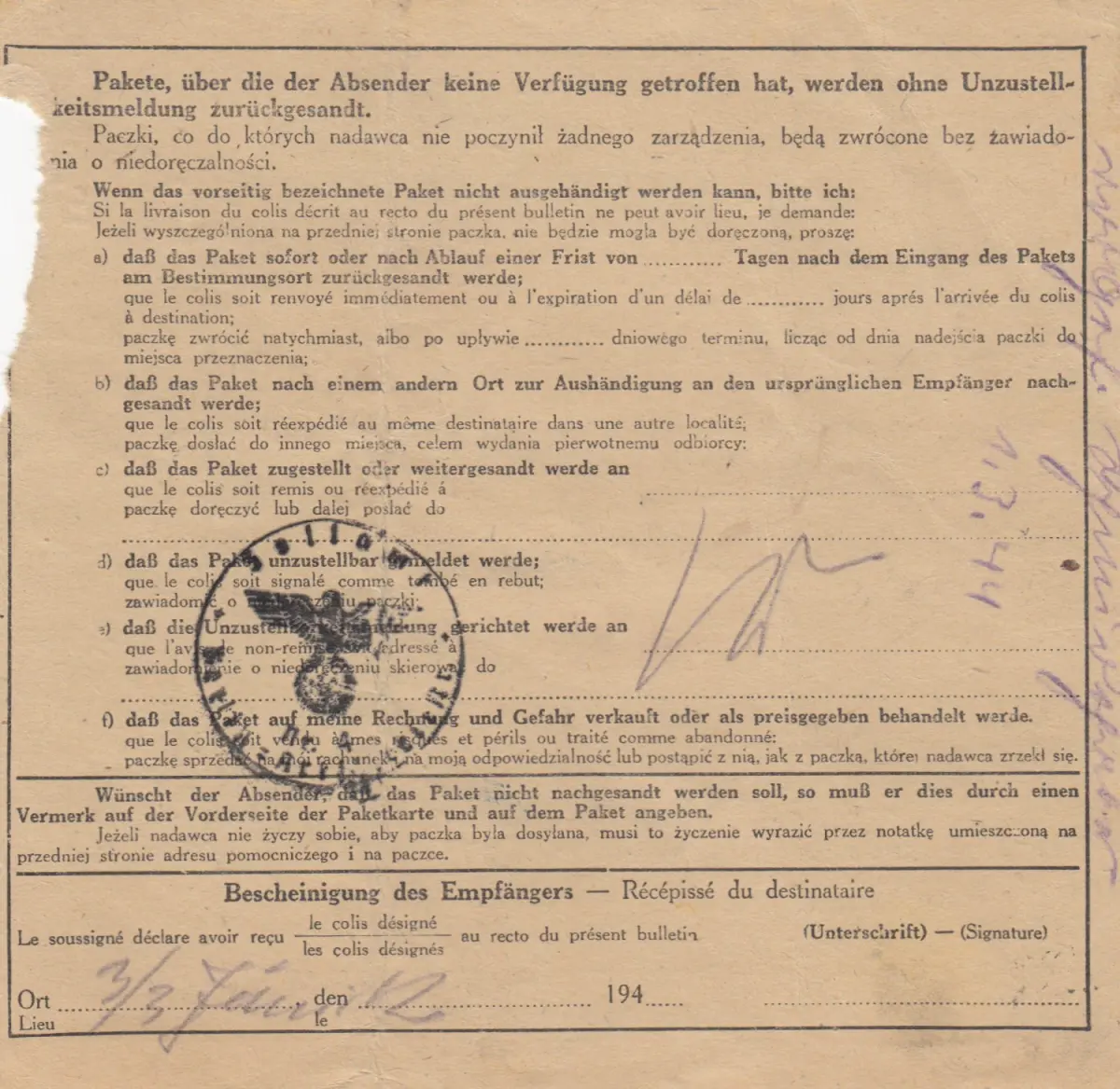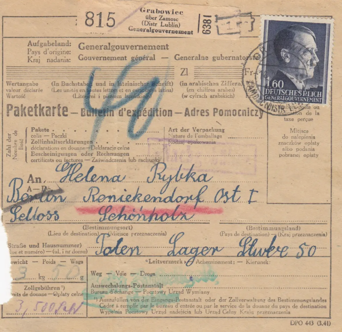 GG: Carte de colis international Grabowiec vers Berlin, Pologne Lager, EF Min°88A