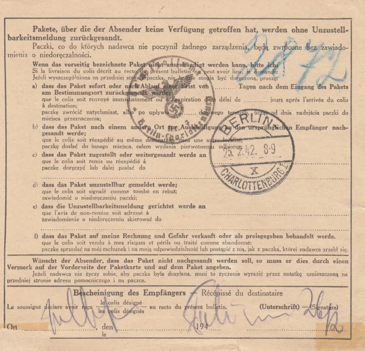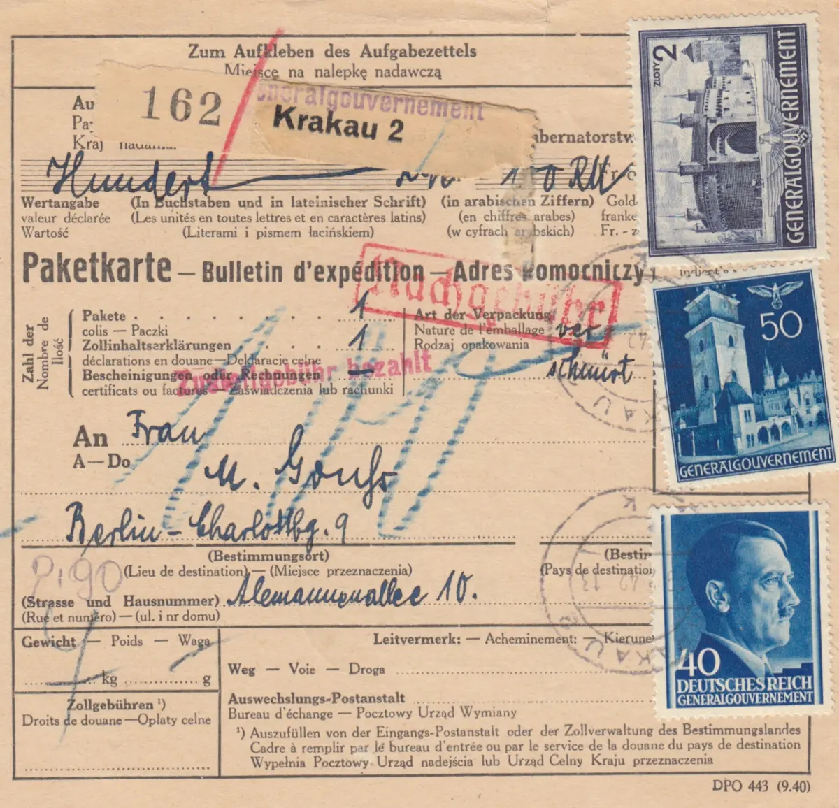 Carte de colis international GG Cracovie-Berlin, Douane 100 gr. au lieu de 80 gr