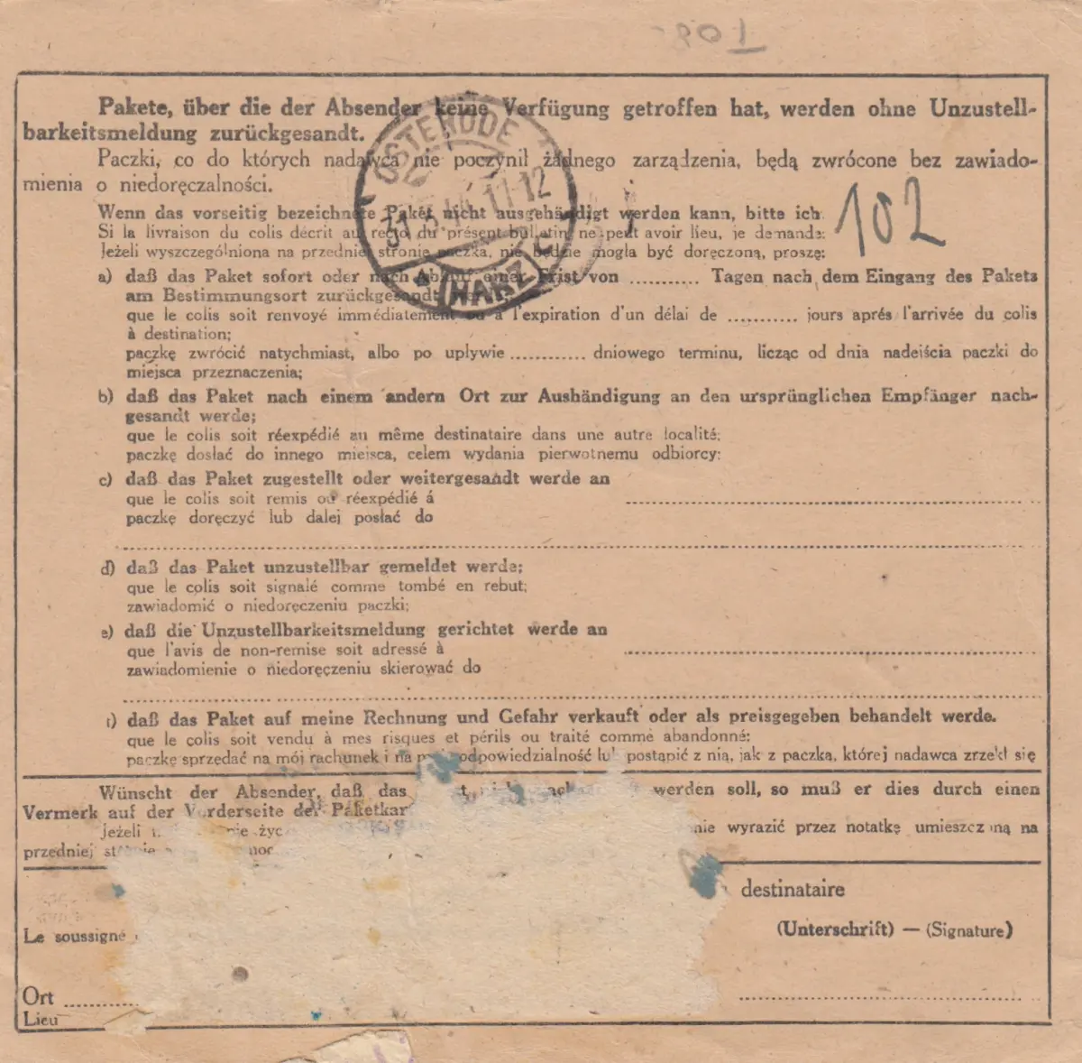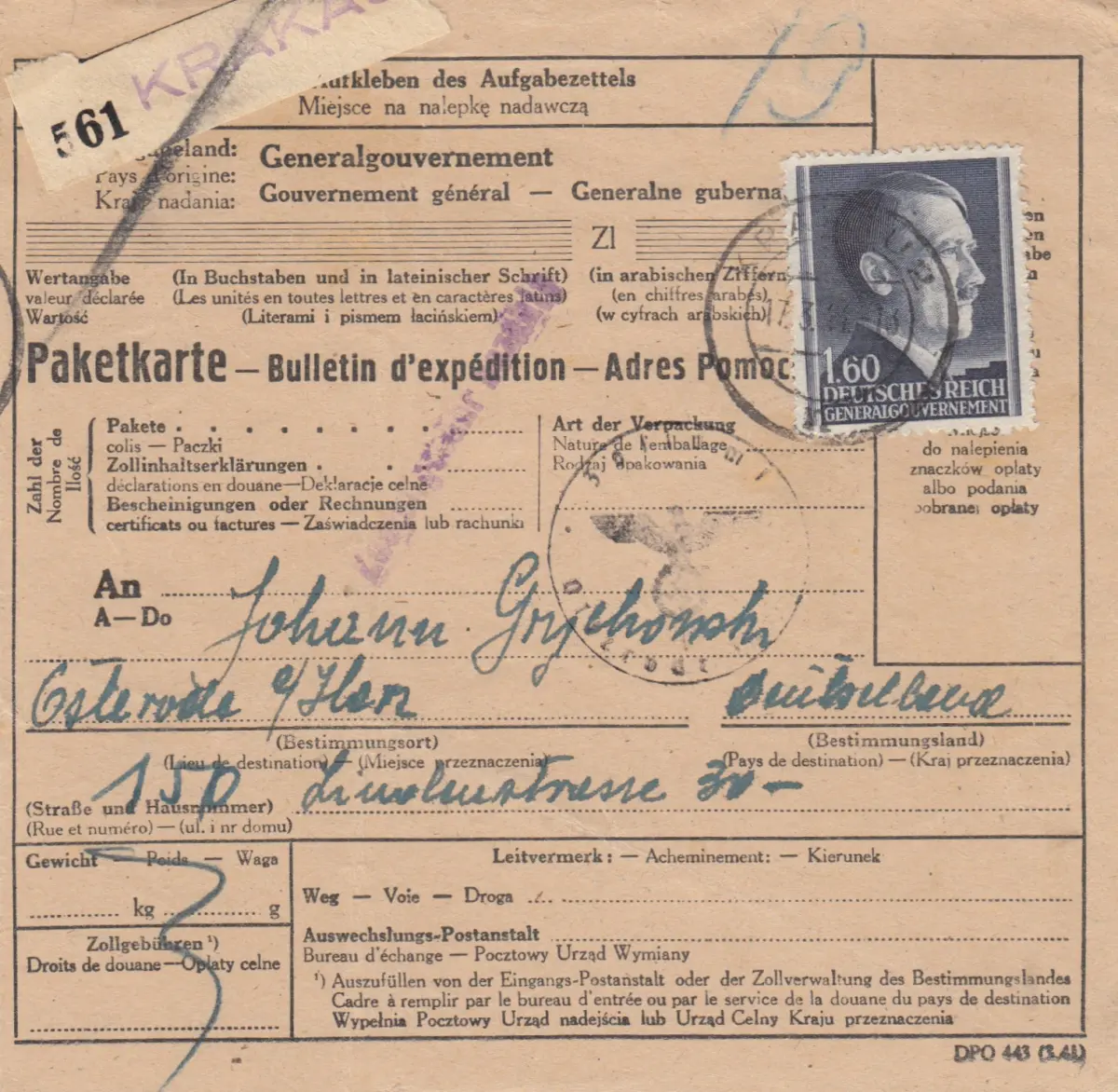 GG: Carte de colis international Cracovie - Résine de Osterode, Mi Nr. 88A, EF