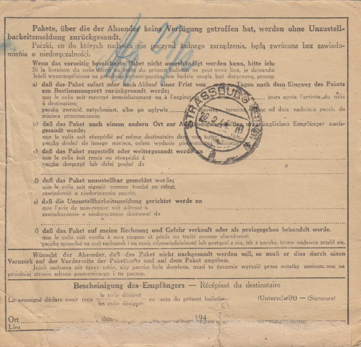 Carte de colis international GG Lezajsk à Strasbourg, chasseur volontaire Div. Galice