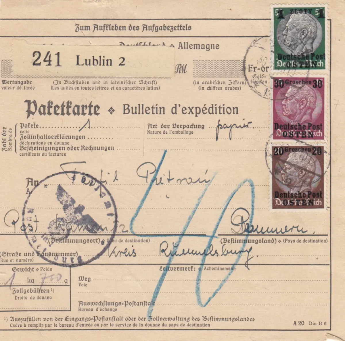 Carte de colis international GG Lublin vers Rümmelsburg/Poméranie
