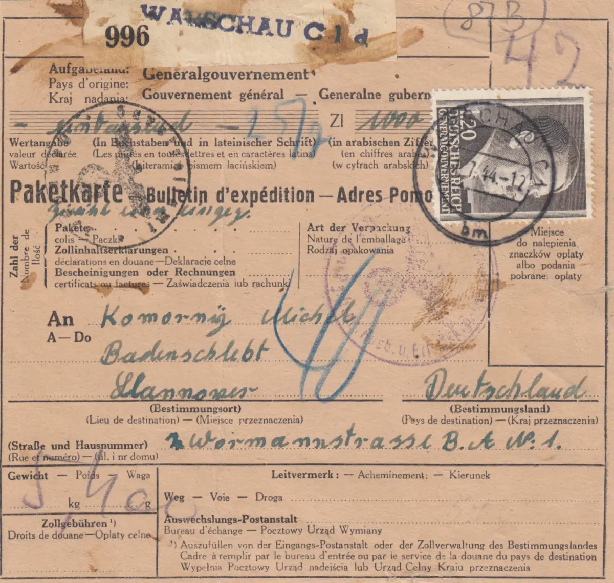 GG: Carte colis international Mi Nr. 87B EF !!!, Varsovie - Hanovre, Déchirure