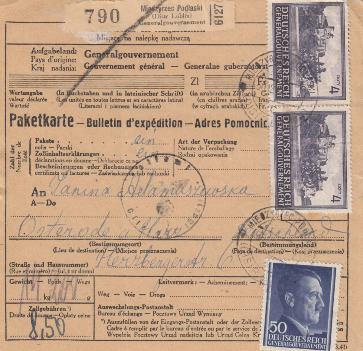 Carte de paquets internationaux GG Miadzyrzec Podlaski - Osterode, MiF 4 Zloty