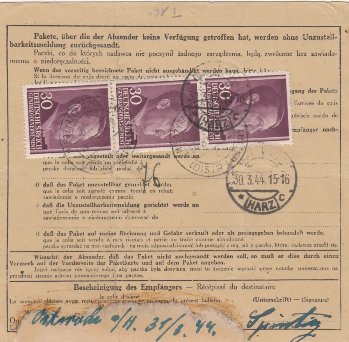Carte de paquets internationaux GG Miedrzyrzec Podlaski vers Osterode