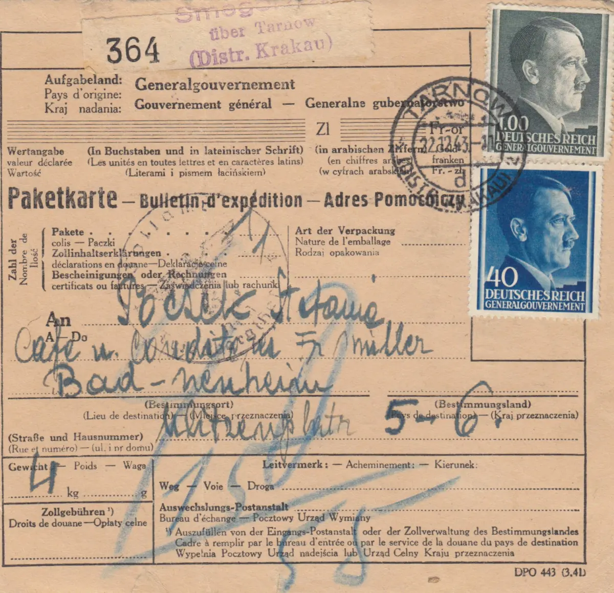 GG: Carte de colis international Tarnow vers Bad Nauheim-Stager, timbre: Détourner.
