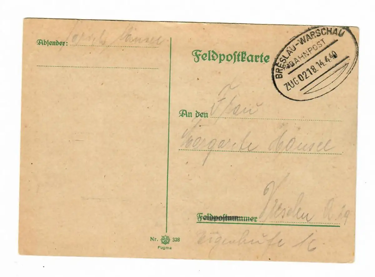 Tampon de la poste GG: Carte postale de champ de Wroclaw-Varsovie Numéro de train 0218 vers Dresde
