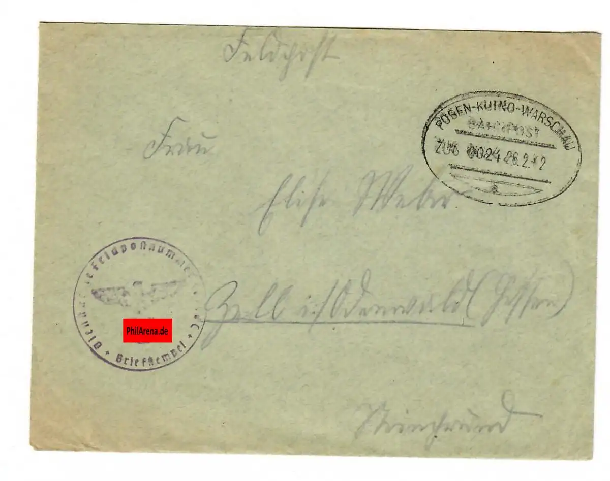 Tampon de poste GG: Revue de la poste de Poznan-Kutno sur lettre de courrier de champ