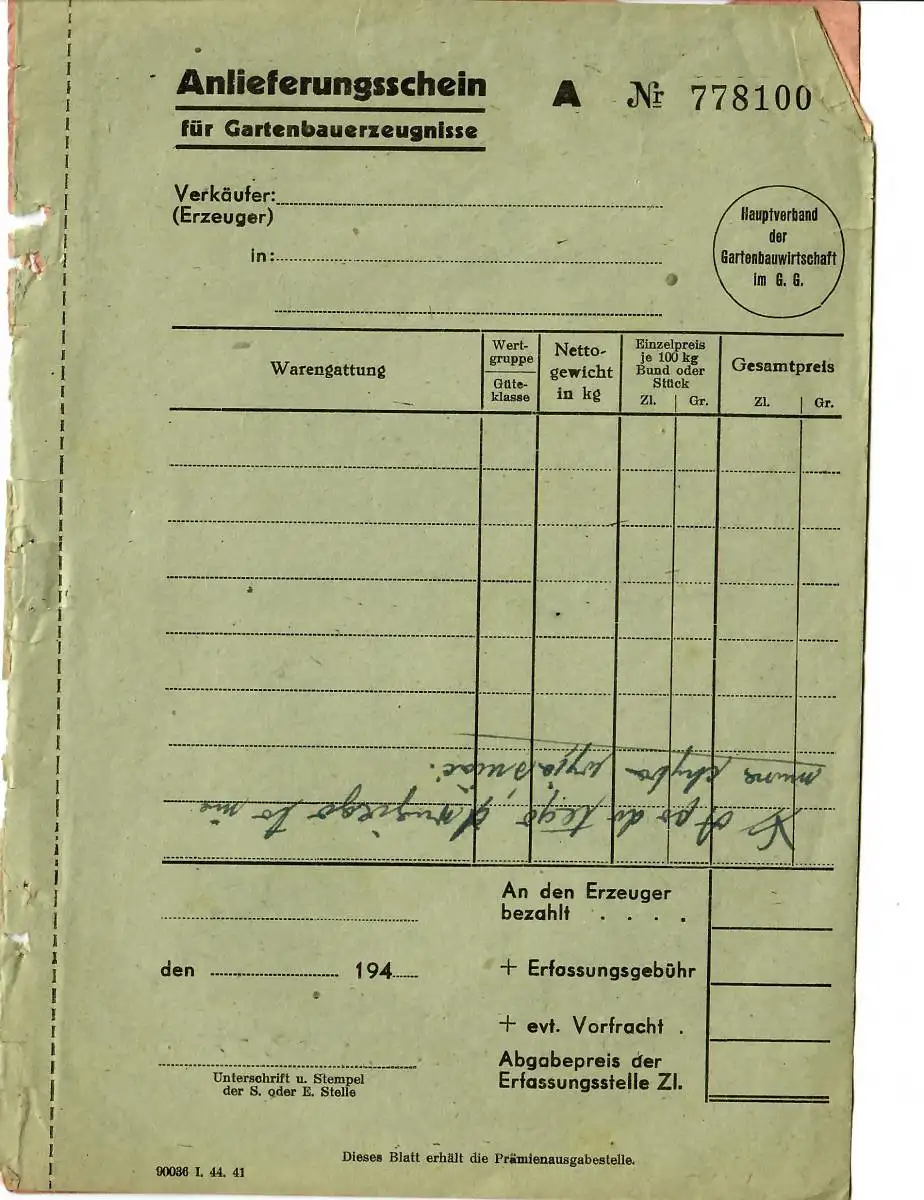 GG: Blanko Certificat de livraison de produits horticoles, 1941