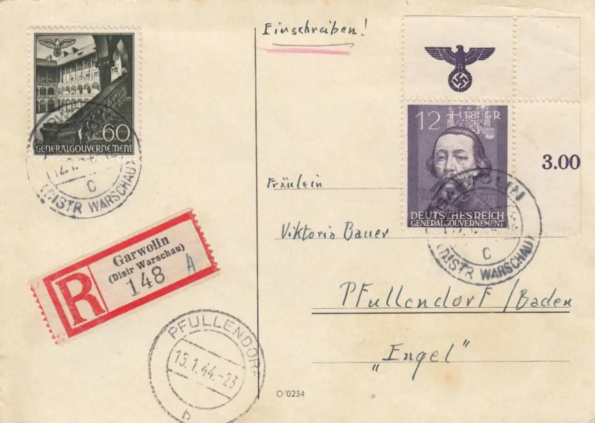 GG: Carte avec MiF Allemande significative, portojuste Garwolin vers Pfullendorf