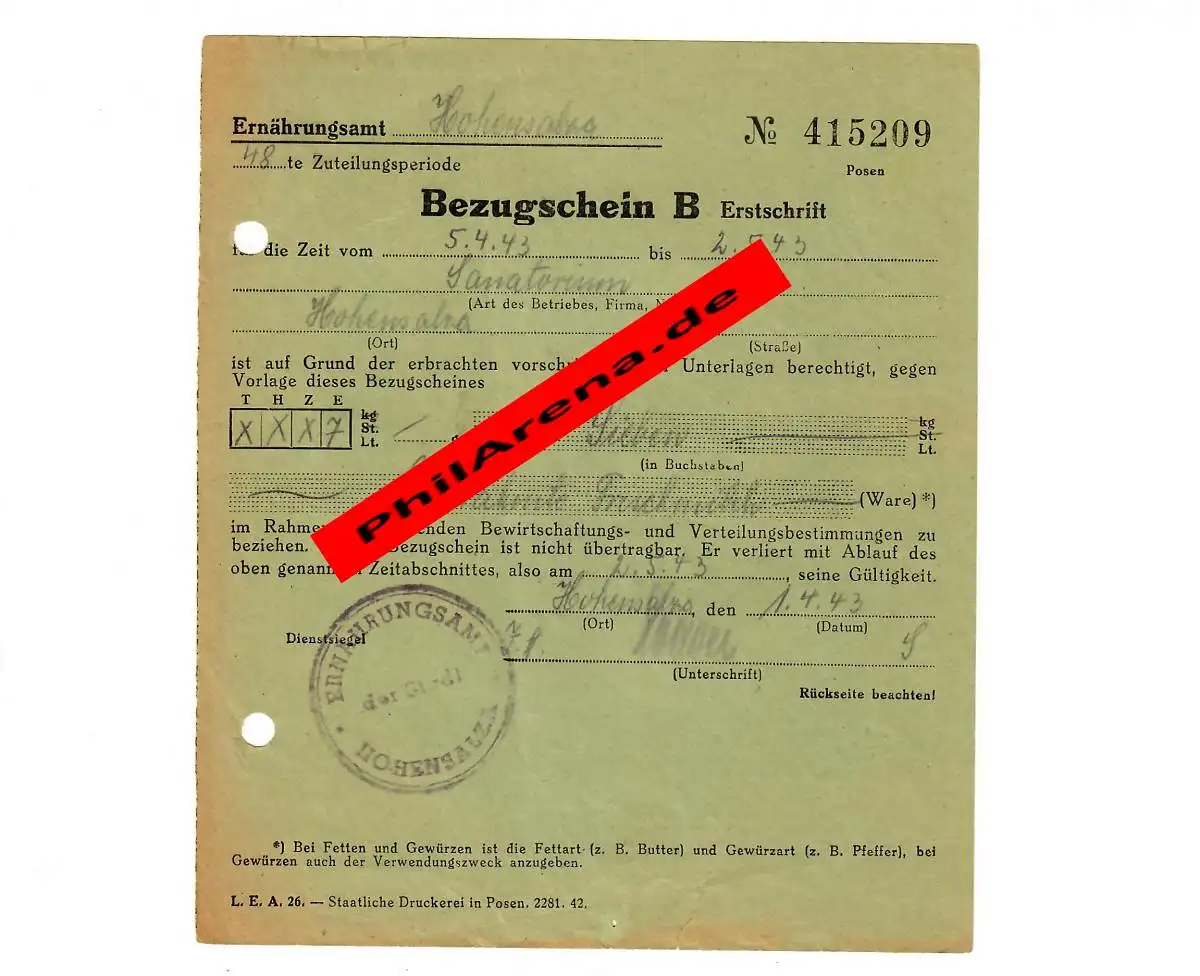 GG Certificat de référence pour 7 litres de lait frais décomposé pour le sanatorium Hohensalla 1943