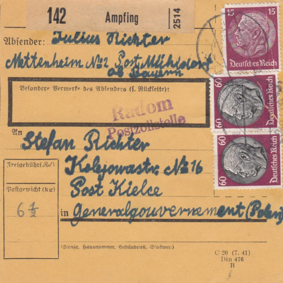 GG DR-GG: Cartes de colis Ambiging vers Kielce - Bureau de douane de poste de Radom !!!