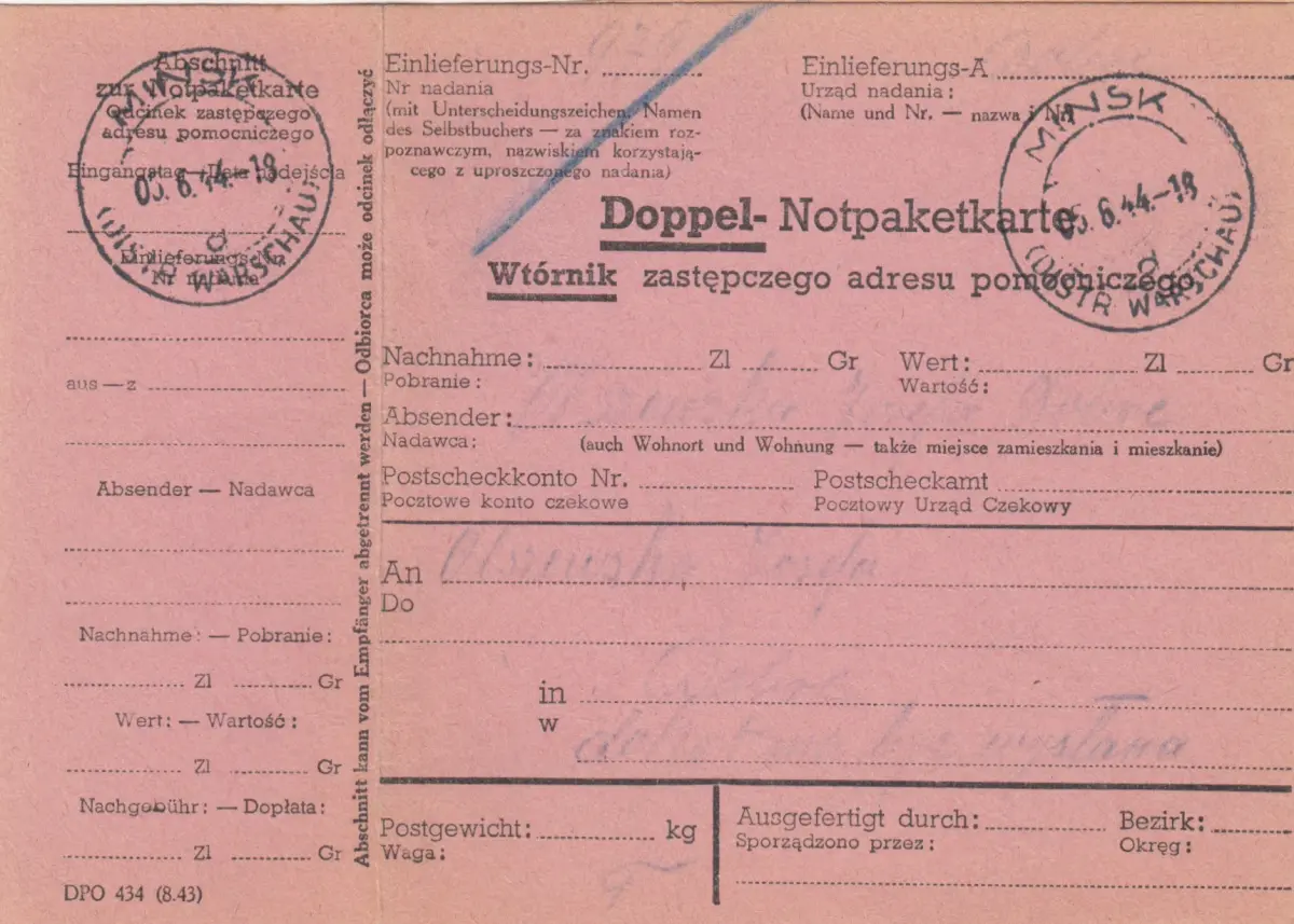 GG Doppelnotpaketkarte, Minsk mit anhängender Notpaketkarte